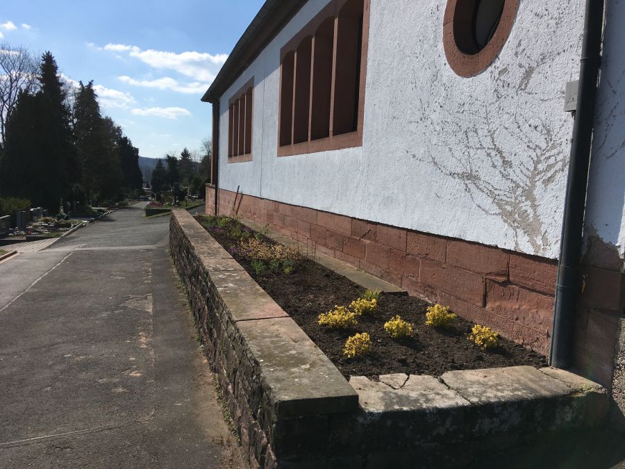 Der Friedhof ist mehr denn je Begegnungs- und Verweilort für die Bürgerinnen und Bürger. Die Ortsgemeinde will ihn nicht nur deshalb entsprechend ansprechend gestalten und pflegen. So gehen auch in Krisenzeiten auf dem Friedhof kleinere und größere Projekte der Ortsgemeinde weiter. Nachdem der neue Eingangsbereich fertiggestellt ist, sollen weitere Maßnahmen folgen, um das Gesamtbild des Friedhofs zu verschönern. Die ersten Pflanzprojekte, das Blumenbeet an der Leichenhalle und eine Wegebepflanzung, sind bereits abgeschlossen: