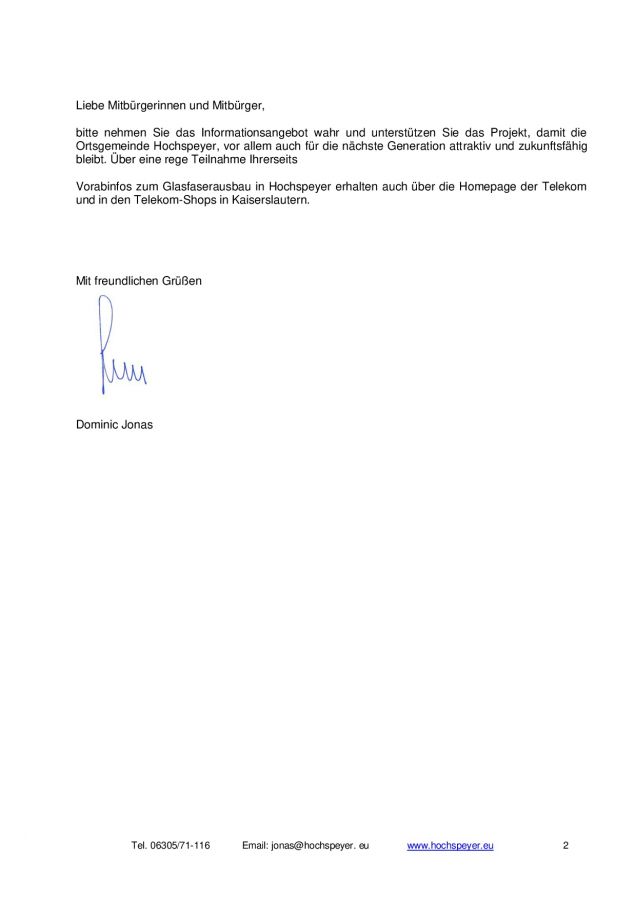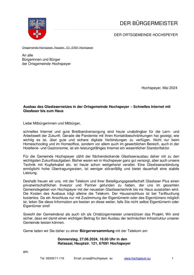 Die Firma GlasfaserPlus GmbH, ein Beteiligungsunternehmen der Telekom Deutschland GmbH, beabsichtigt das Telekommunikationsnetz im Gebiet der Gemeinde Hochspeyer eigenfinanziert auf ein modernes Glasfasernetz (Glasfaser bis ins Gebäude bzw. bis in die Wohnung) aufzurüsten.
