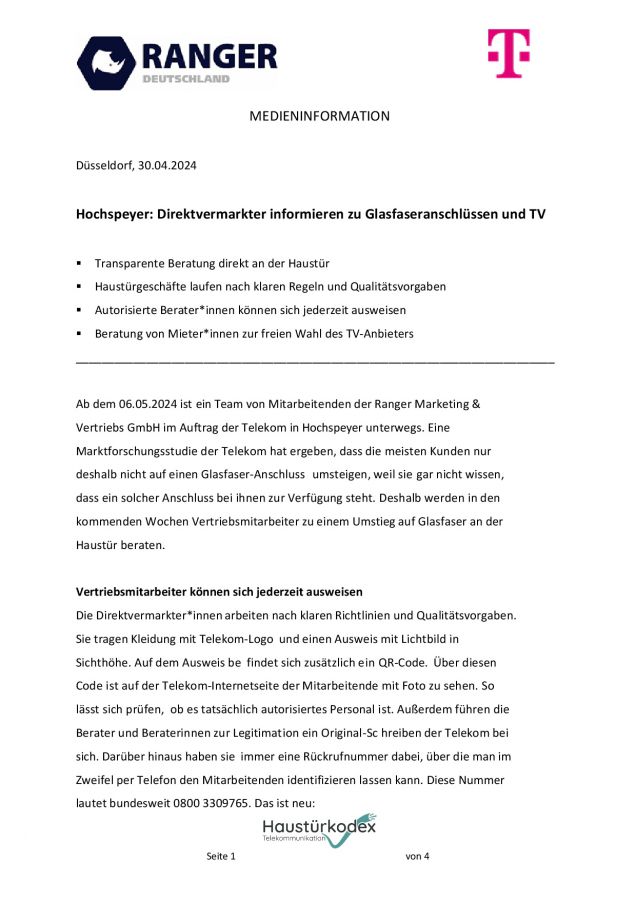 02.05.2024_Team im Auftrag der Telekom informiert ab 06.05.2024 vor Ort über Glasfaseranschlüsse und TV