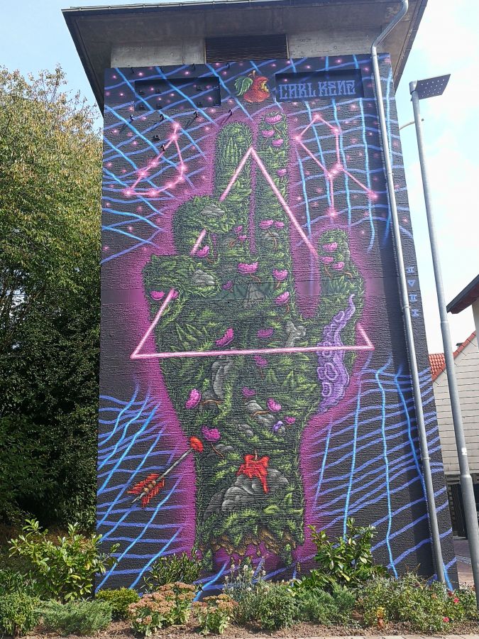 Im Jahr 2020 erschuf der Künstler Carl Kenz ein großflächiges Mural-Art Kunstobjekt mit dem Namen "Energie" an der Trafostation Wiesenstraße. Bestaunen Sie das künstlerische Projekt in der Ortsmitte.