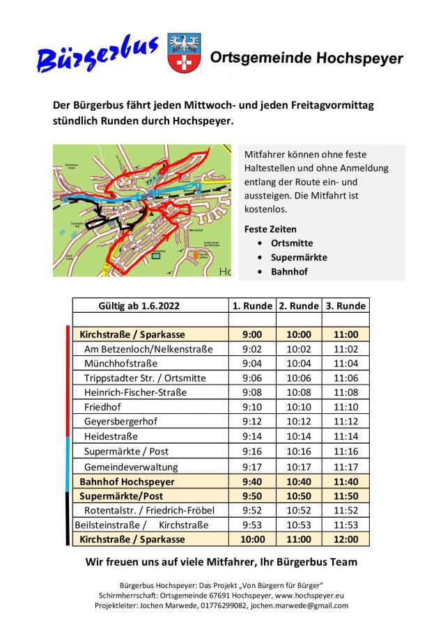 Der Bus fährt jeden Mittwoch und jeden Freitag feste Runden durch Hochspeyer. Die Route ist so ausgelegt, dass alle Wohngebiete mit möglichst kurzem Fußweg angebunden sind und möglichst viele Geschäfte, Ärzte, Dienstleister und viele wichtige Punkte, wie der Friedhof mit dem Bürgerbus, erreichbar sind.