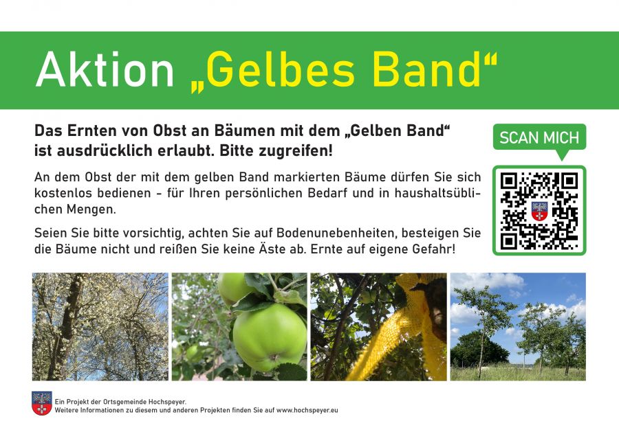Dann greifen Sie zu, überall dort (in der Ortsgemeinde), wo Sie ein „Gelbes Band“ an einem Baum sehen ist das kostenlose Ernten für den persönlichen Bedarf und in haushaltsüblichen Mengen ausdrücklich erlaubt!