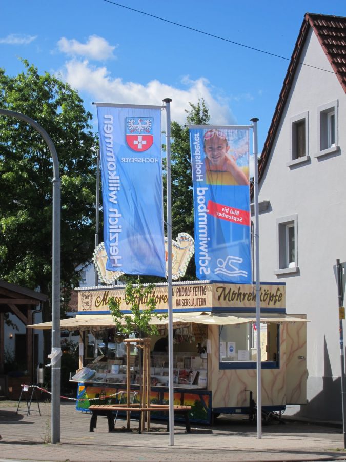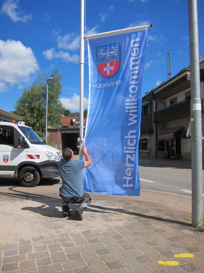 Seit geraumer Zeit wehen zwei Fahnen der Ortsgemeinde in der Ortsmitte zur Begrüßung der Gäste und der Hochspeyerer Bürgerinnen und Bürger.