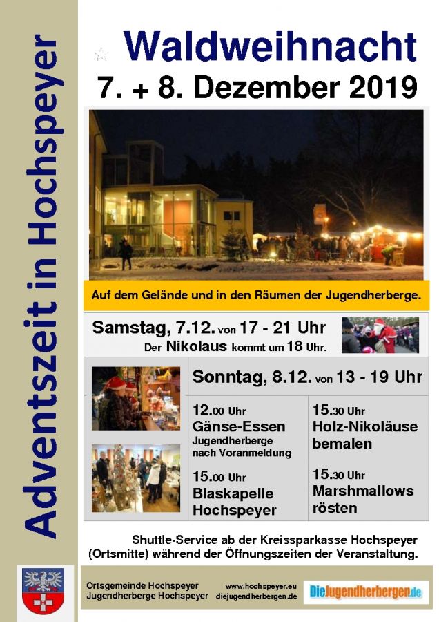 Bei der Waldweihnacht Hochspeyer genießen die Besucher eine kleine Auszeit von der vorweihnachtlichen Hektik, spüren die Ruhe und die weihnachtliche Stimmung mitten im Wald. Erleben auch Sie einen unverwechselbaren Tag an den Ständen und Buden, in der gemütlichen Außen-Lounge oder im ganztags geöffneten Adventscafé in der Jugendherberge.