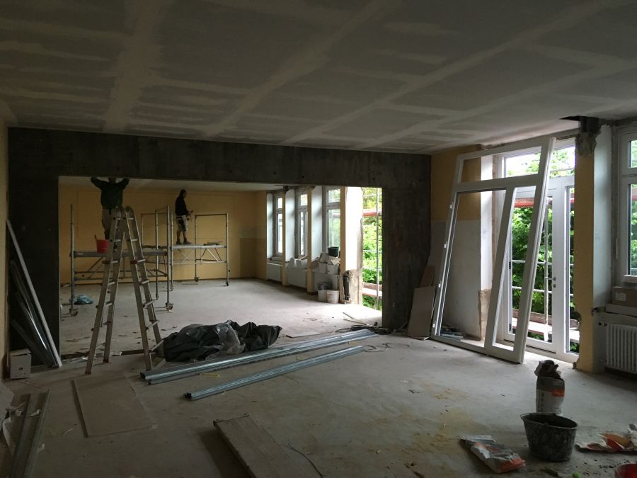 Die Arbeiten für den neuen Standort der Gemeindebücherei, dem Veranstaltungsraum und den Räumen zur Vereinsnutzung in der Kreuzhohlstraße 2 nehmen Gestalt an.