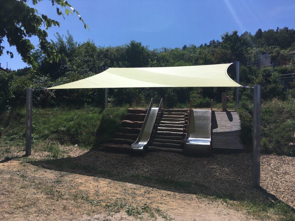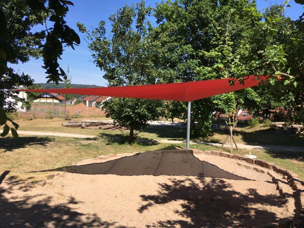 Über den zentralen Spielanlagen in unserer Kindertagesstätte Schelmenhaus wurden zwei großflächige Sonnensegel angebracht, damit die Kinder Ihren Außenspieldrang größtmöglich im Schatten stillen können.