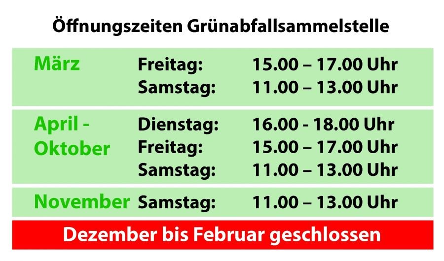 Die Grünabfallsammelstelle ist seit 1. März wieder geöffnet. Zur Info die Öffnungszeiten: