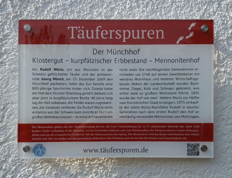 Das Täuferschild am Münchhof weist auf den Schweizer Einwanderer, Täufer und Pächter Rudolf Würtz hin, der das Anwesen im Jahr 1669 pachtete, nachdem er auf das Härteste verfolgt wurde und aus seiner Heimat floh. In der Kurpfalz waren fremde Siedler, egal welchen Glaubens, willkommen, denn sie halfen, das nach dem 30-jährigen Krieg entvölkerte und verwüstete Land wieder aufzubauen. Die Glaubensgemeinschaft der Täufer hat bis heute überlebt und ist unter der Konfessionsbezeichnung „Mennoniten“ geläufig.